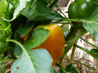 In other pepper news, eleven (11!) bell pepper plants is Not Nearly Enough. I don't eat the green ones, since my discovery of the Pizza My Heart variety from Territorial or Renee's or Shepherd's, which are a tasty bell taste, although pointy in shape. Instead, I wait impatiently for them to ripen. But with only a few plants, miserliness rules the day. I eat some, stir-fry some, and roast and freeze the rest. If I doubled my planting, I could gobble and roast and make roasted pepper soup and and and... you get the picture.